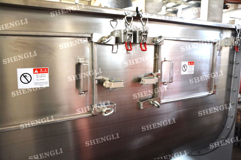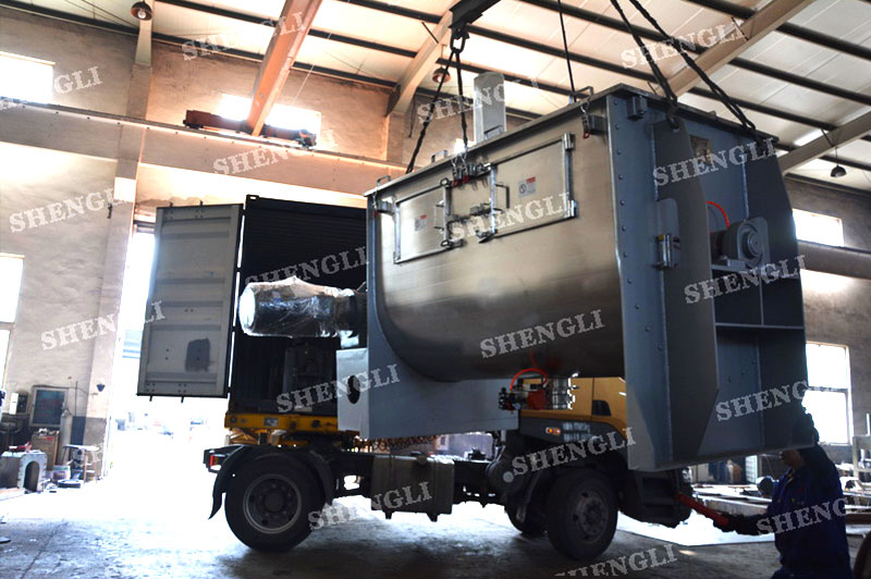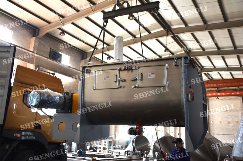 工作原理:螺帶臥式攪拌設備采用U型筒體,內裝平行主軸,主軸上安裝正反雙向的盤條螺帶,不同維度螺帶分內螺帶與外螺帶,物料在螺帶的驅使下反復參混,能夠快速高效的混合。